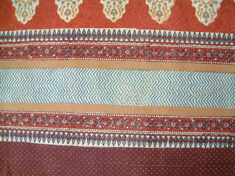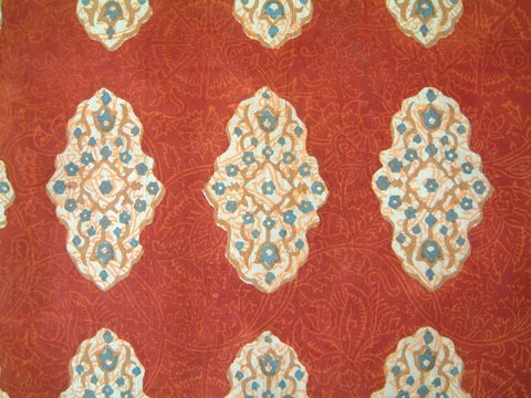 - A delicate floral filigree of cinnamon, turmeric and turquoise on a red orange ground