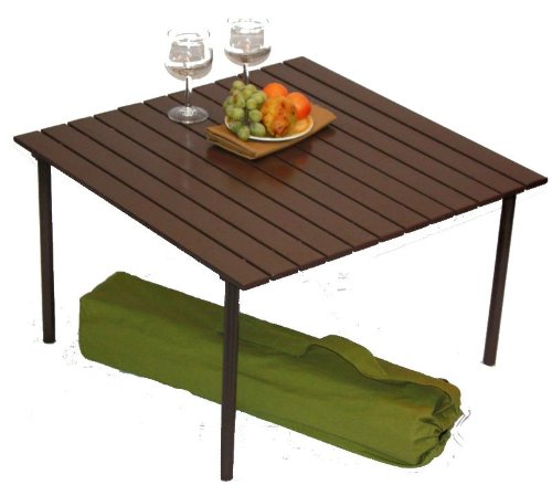 The perfect portable table that goes anywhere. Portable table for any indoor or outdoor activity. Collapsible table rolls up in minutes and fits into an easy carry bag. Unique compact and portable design offers the most convenient way to have a full-size table anywhere you want. For picnics, park, camping, lake, river, beach, lawn concerts, vacation. Water resistant wood top, 2 cross bars, 4 legs and a mesh carrying bag with pocket. Set up size is 27 inches wide by 27 inches long by 16 inches h...